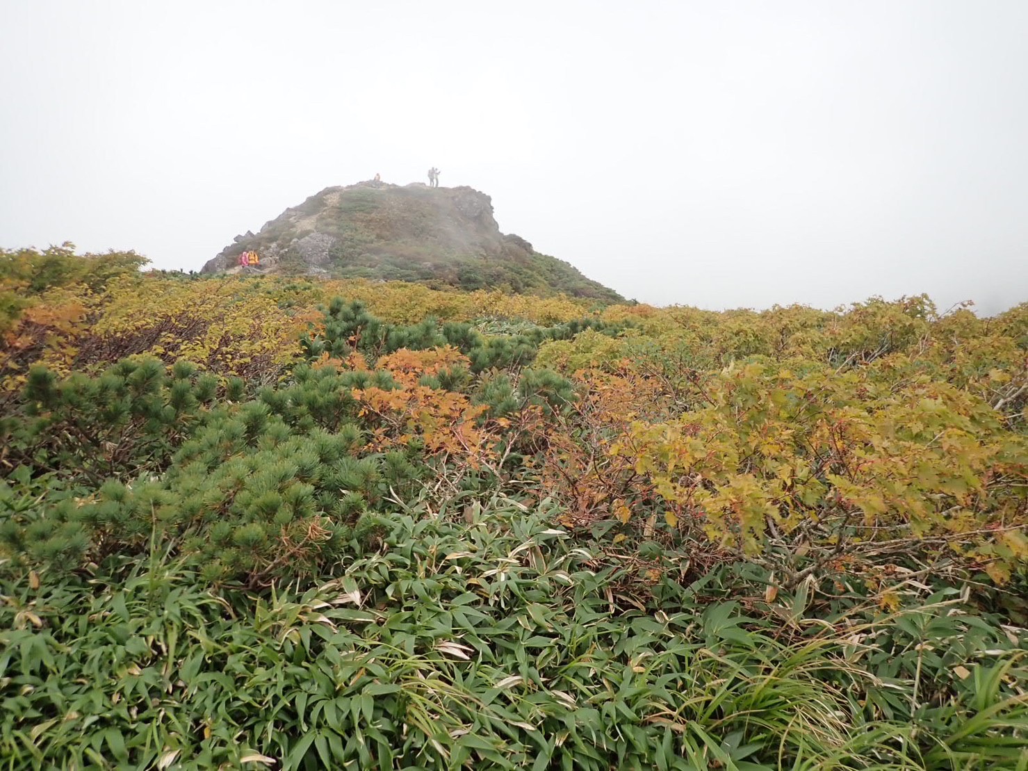 3日目は宿に不要な荷物を預けて三ツ石山登山に出発。登り始めは樹林帯の急登だが、次第になだらかになり、展望が開けると三ツ石山荘が見えた。笹原を直登し山頂の岩を登って振り返ると、ガスの切れ間に色付き初めの緑の絨毯が360度広がっていた。おりからの強風に写真を撮ってすぐに下山。宿で入浴して、硫黄臭い身体で盛岡行きのバスに乗り込んだ。 (コースタイムとも記 鈴木)